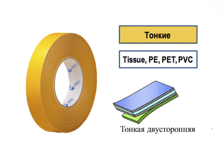 • Двухсторонняя лента на тонкой нетканой основе. Этот скотч состоит из тонкой пленочной основы, которая имеет высокую прочность на разрыв. Клейкая лента обладает высоким уровнем склейки, поэтому активно используется для декорирования и проклейки окон. Она отлично крепит мелкие элементы и в кратчайшие сроки создает дизайн оконной рамы. Лента доступна в нескольких цветовых решениях, что позволяет незаметно совершить фиксацию. Ее тонкая основа помогает создать четкий контур и защищает поверхность от внешнего воздействия. Скотч универсален в использовании и применяется не только на производствах, а и в быту. Такая основа обеспечивает хорошую фиксацию к металлическим и пластиковым материалам, из которых чаще всего создают оконные рамы. Она обладает начальной адгезией и стойкостью к влаге. Лента работает в условиях резких перепадов температур и не теряет индивидуальных характеристик. Поэтому ее также применяют для изготовления окон на производствах и в цехах. Такие ленты имеют небольшую толщину, поэтому быстро фиксируются на неровных поверхностях, что значительно экономит время при работе.